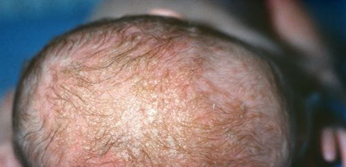 - بشرة دُهنية أو جافة مغطاة بقشور بيضاء أو صفراء