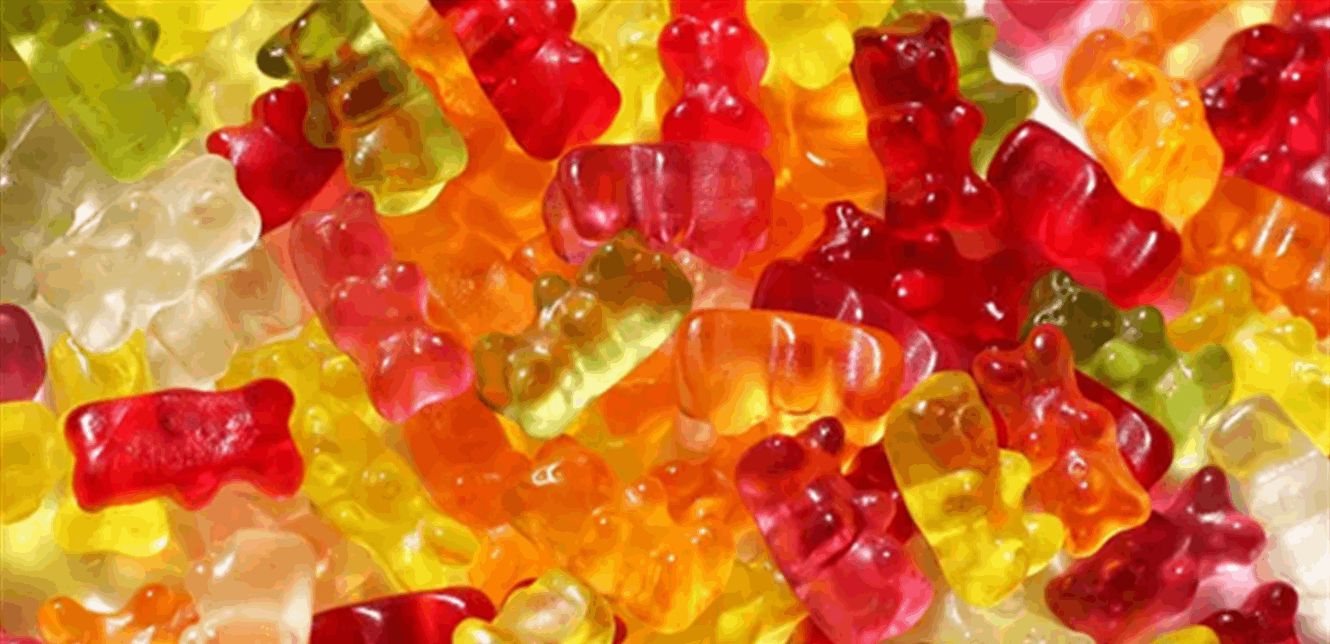 مثل الدببة الجيلاتينية والحلوى المطاطية الحامضة، ويبدأ تصنيعها كسائل ثم تتماسك بفضل الجيلاتين لتعطي القوام المطاطي المعروف.