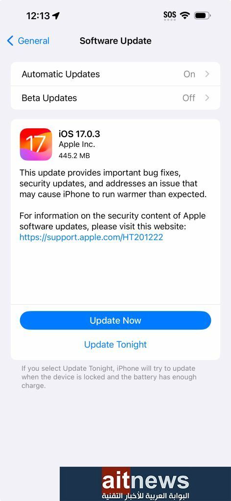 ويمكن للمستخدمين تنزيل التحديث البرمجي iOS 17.0.3 عبر أجهزة آيفون المؤهلة من خلال الانتقال إلى تطبيق الإعدادات واختيار عام ومن ثم اختيار خيار تحديث البرنامج.