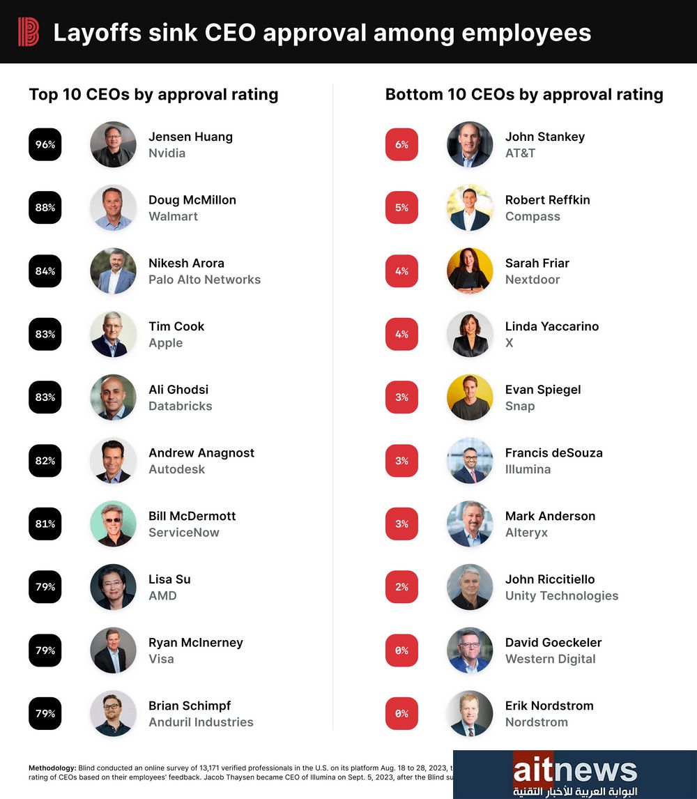 التقرير الصادر من الشبكة الاجتماعية Blind يكشف مجموعة من المديرين التنفيذيين ومستوى شعبيتهم بدقة، لأن الدراسة التي صدر منها هذا التقرير ركز على العوامل الهامة المساهمة في تصنيف المدير التنفيذي مثل: أداء الشركة، وإدارة القوى العاملة، و التعويضات، والقيادة الحكيمة، ونسبة التعويضات العادلة. شملت الدراسة آراء 13,171 من المهنيين المحترفين والمعتمدين، مع تحليل أداء 103 من المديرين التنفيذيين.