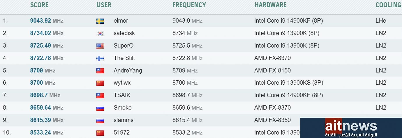 كسر أخر لمعالج إنتل Core i9-14900KF حقق تردد قدره 9.1 جيجاهرتز، ولكن حتى هذه اللحظة لم تحصل النتيجة على تأكيد رسمي لإدراجها في القائمة والبرهان الوحيد الصورة المرفقة فقط لبرنامج CPU-Z.