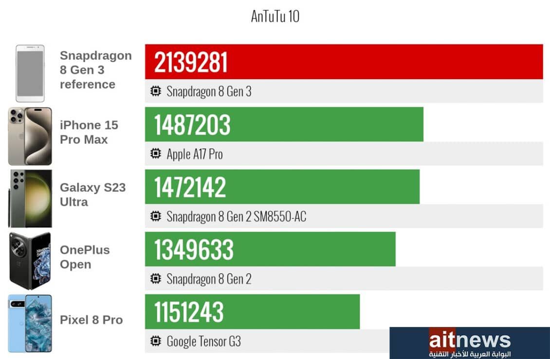 وبحسب النتائج المنشورة، فقد سجل المعالج 2.13 مليون نقطة إجمالًا في منصة 10 AnTuTu، متفوقًا بنسبة تصل إلى 30% مقارنةً بالإصدار السابق سنابدراجون 8 جين 2، وكذلك معالج آبل الجديد A17 برو في هواتف آيفون 15 برو، حيث سجل 1.48 مليون نقطة.