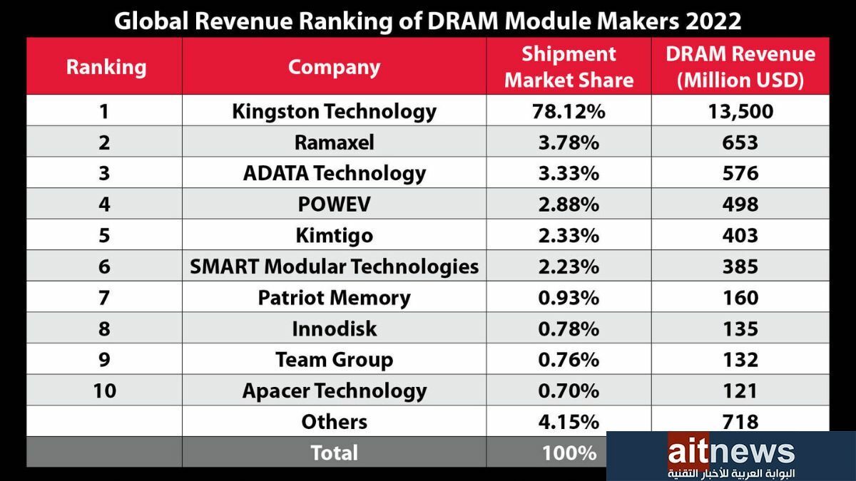 يأتي هذا التصنيف الرسمي حسب عدد الإيرادات التي رُصدت في أحدث تقرير من مجموعة أبحاث Technavio، وتحتفظ كينجستون بمركزها الأول بنسبة حصة سوقية تبلغ 78.12% وعائدات تبلغ 13.5 مليار دولارًا أمريكي. تشير TrendForce إلى أن مبيعات ذاكرة DRAM في عام 2022 شهدت انخفاضًا بنسبة 4.6% في المعدل السنوي في جميع أنحاء الصناعة.