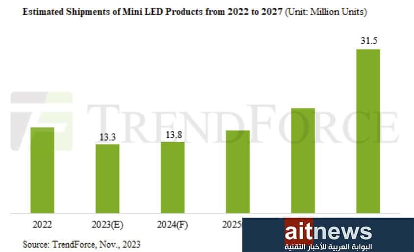 بسبب انخفاض الطلب على الأجهزة الإلكترونية الاستهلاكية، من المتوقع أن تنخفض شحنات منتجات Mini LED إلى 13.337 مليون قطعة في عام 2023. ومع ذلك، من المتوقع أن ينتعش السوق في عام 2024، حيث تقدر أن تصل عدد الشحنات إلى 13.792 مليون قطعة، ومن المتوقع أيضًا أن يستمر توجه النمو حتى عام 2027.