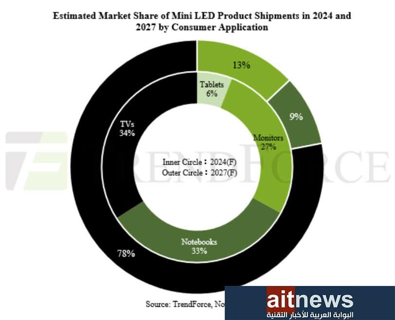 لهذا، تؤكد مجموعة أبحاث TrendForce أن إضاءة Mini LED تبقى الحل الأمثل والأكثر فعالية. في هذا السياق، فإن التوقعات الخاصة بأجهزة تلفاز Mini LED تبدو إيجابية، مع توقع نمو مستمر في أعداد الشحنات. ومن المتوقع أن تصل الشحنات إلى 6.21 مليون قطعة بحلول عام 2024، مما يمثل زيادة بنسبة تبلغ 53.5% سنوياً. و بالمضي قدمًا حتى عام 2027، من المتوقع أن تصل أعداد الشحنات إلى 24.4 مليون قطعة، لتستحوذ على ما يقرب من 12.1% من سوق أجهزة التلفاز الإجمالي. ومن المتوقع أن يصل معدل النمو السنوي المركب لهذا القطاع من 2023 إلى 2027 حوالي 56.7%.