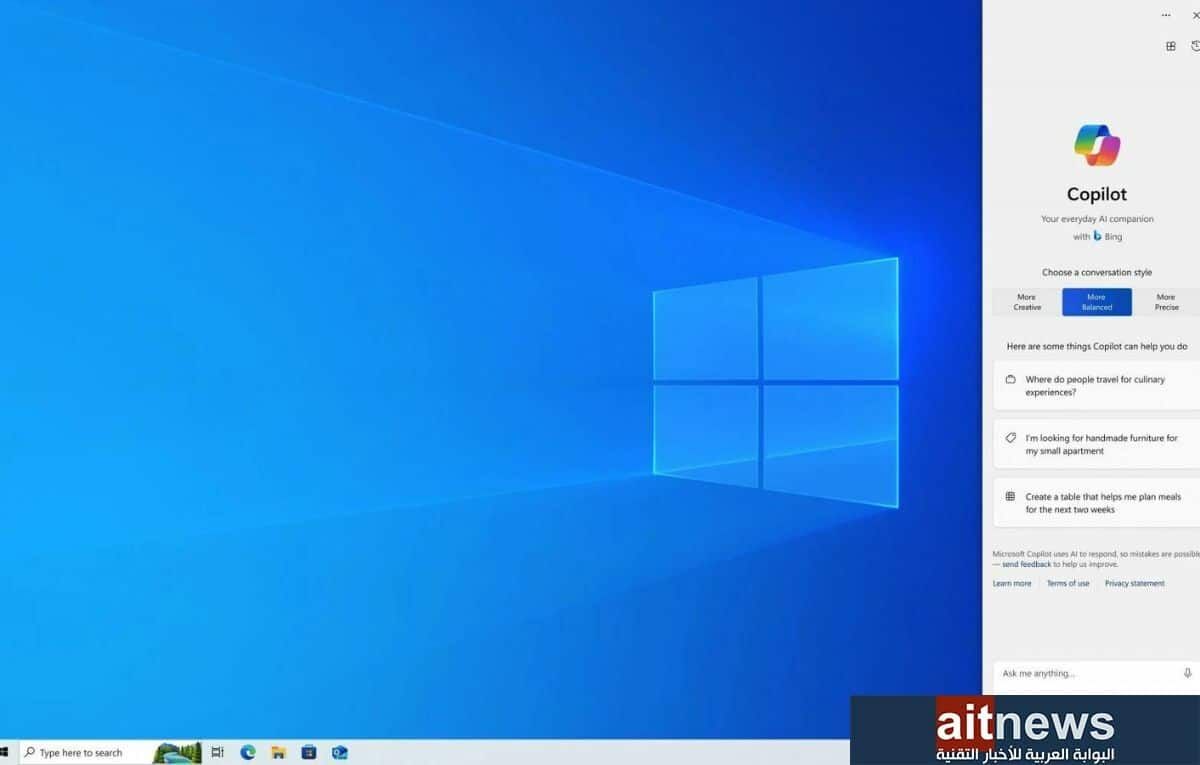 ويصبح المستخدمون قادرين على تشغيل مساعد الذكاء الاصطناعي من خلال النقر على أيقونة Copilot الجديدة في شريط مهام ويندوز بعد إضافة Copilot إلى نظام التشغيل ويندوز 10.