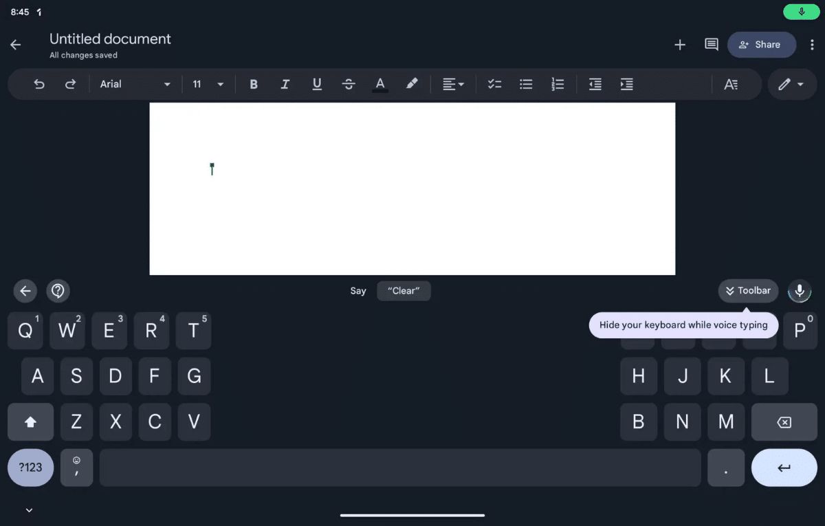 ويأتي شريط أدوات الكتابة الصوتية المساعد حتى الآن مع النسخة التجريبية من تطبيق لوحة المفاتيح Gboard برقم الإصدار 13.7 عبر جهاز Pixel Tablet الذي يعمل بإصدار المنصة ربع السنوي الأول المستقر من أندرويد 14.