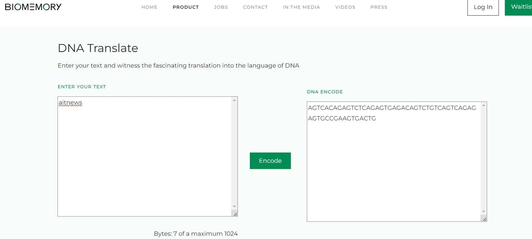 اللافت أنك إذا قمت باختبار وظيفة DNA Encode من شركة Biomemory على موقعها الإلكتروني، فستكون قادرًا على كتابة نص بحد أقصى يصل إلى 1024 حرفًا أو بايتًا، وترميزها بالحمض النووي مباشرة.