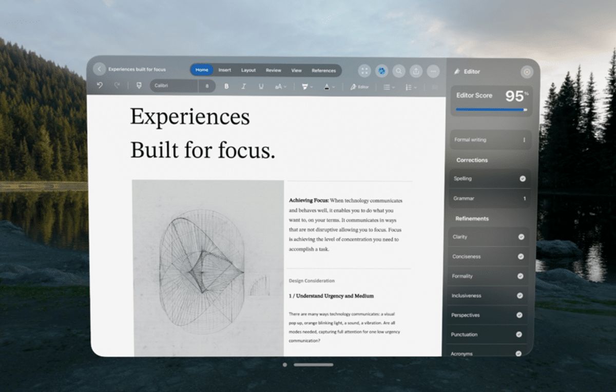 ويتضمن تطبيق وورد لنظارة فيجين برو وضع تركيز يشبه إلى حد كبير وضع القارئ الموجود في الإصدارات الموجهة لأجهزة الحواسيب، إلى جانب واجهة الشريط التي تبدو سهلة اللمس.