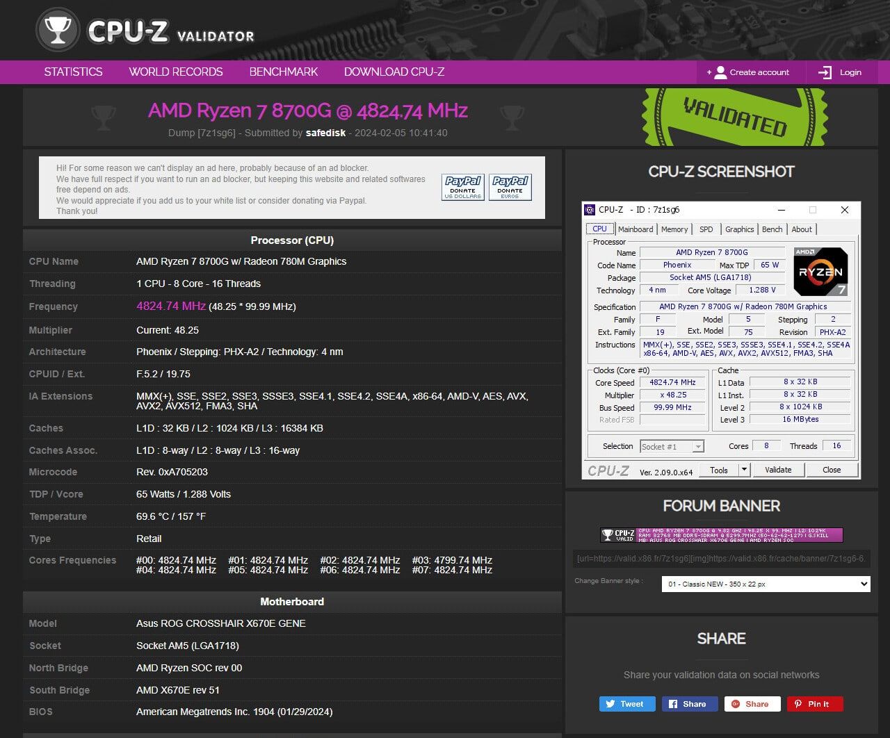 حقق كاسر السرعة المشهور SafeDisk، رقمًا قياسيًا جديدًا مع ذاكرة DDR5 على منصة AM5 باستخدام معالج AMD Ryzen 7 8700G واللوحة الأم أسوس ROG Crosshair X670E GENE.