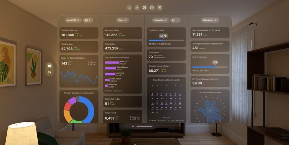 يمكنك فتح أكثر من تطبيق في الوقت نفسه، إذ تقوم الواجهة بتنسيق عرض مختلف التطبيقات أمام عينيك، وستظهر التطبيقات طافية في الهواء كأنها موجودة في مساحتك وبيئتك الطبيعية، ونتيجة لذلك، فإن نقل التطبيقات يشبه نقل العناصر الفعلية من حولك، كما يمكنك تغيير حجمها، وإعادة ترتيبها بسهولة.