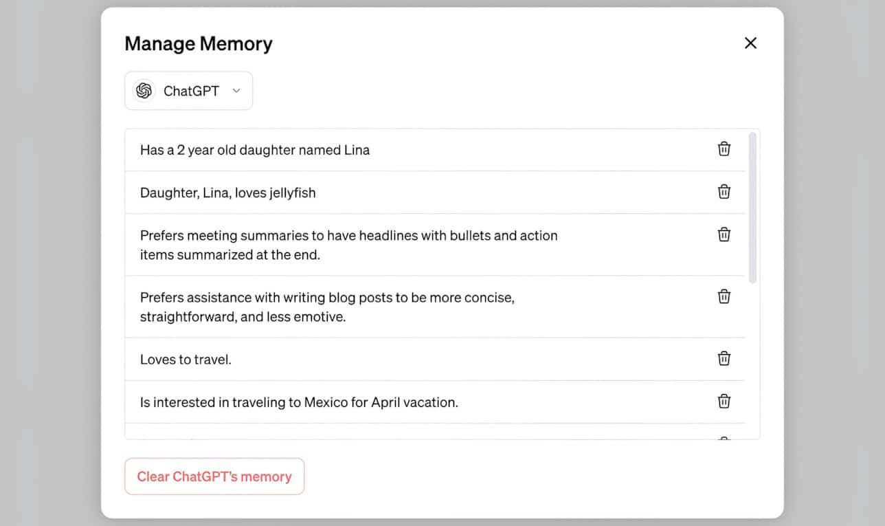 وتعمل ميزة الذاكرة الجديدة في روبوت ChatGPT بطريقتين؛ الأولى هي إخباره بمعلومات محددة على نحو مباشر كالوظيفة أو محل العمل أو لغة البرمجة المفضلة أو أسماء الأبناء ورؤساء العمل وغير ذلك. وأما الطريقة الثانية، فهي السماح للروبوت بالتقاط بعض التفاصيل والمعلومات في سياق المحادثات معه.