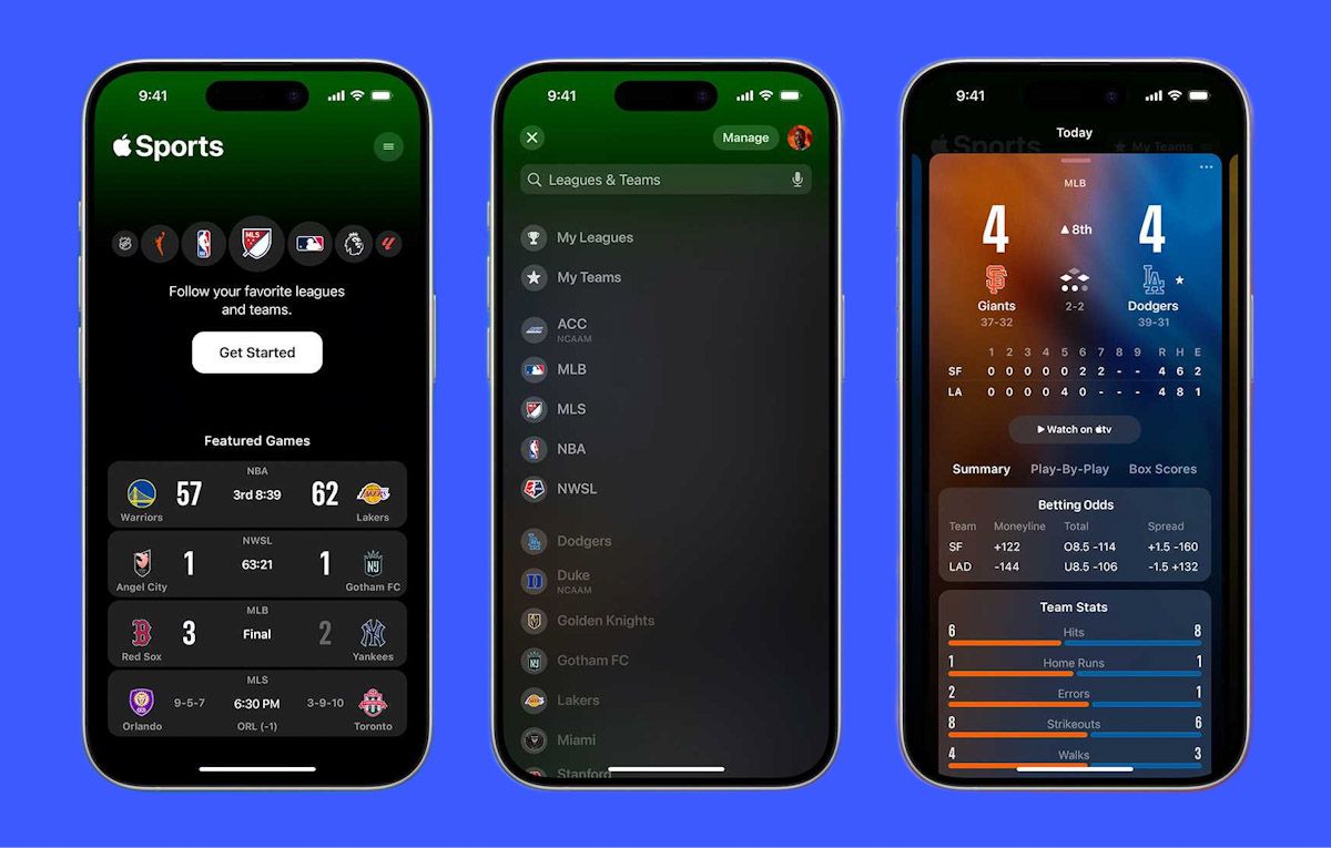 ويتيح تطبيق آبل الجديد Apple Sports الوصول إلى نتائج المباريات والإحصائيات المتعلقة بها في دوريات كرة القدم العالمية مثل الدوري الإنجليزي والإسباني والإيطالي والفرنسي بالإضافة إلى دوري كرة القدم الأمريكية ودوري كرة السلة الأمريكي NBA وغيرها من البطولات، كما وعدت الشركة بإضافة المزيد من البطولات في وقتٍ لاحق.