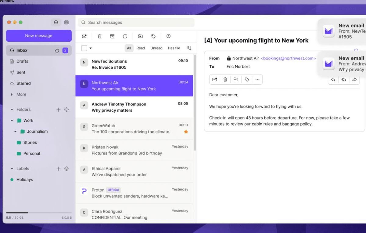 ويعني هذا أنه يمكن تخزين رسائل البريد الإلكتروني مؤقتًا والوصول إليها في حال عدم الاتصال بالإنترنت، في حين يمكن للمستخدمين التحويل إلى Proton Mail مباشرةً من منصة MacOS أو قائمة ابدأ في ويندوز.