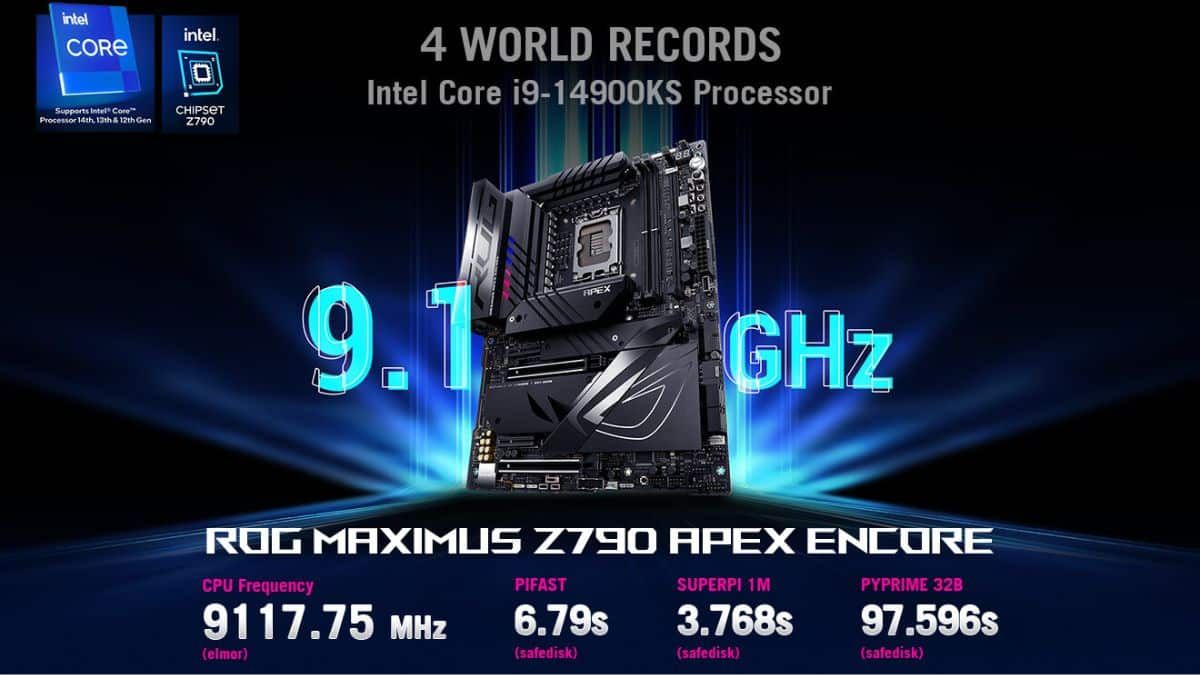 وخلال الأعوام القليلة الماضية، استخدمت اللوحة الأم ROG Maximus Z790 Apex لكسر سرعة المعالج المركزي إنتل Core i9-13900K، من الجيل الثالث عشر، ليصل إلى تردد قدره 9 جيجاهرتز محققًا رقمًا عالميًا مذهلًا، كما استُخدمت اللوحة الأم ROG Maximus Z790 Apex Encore لكسر سرعة المعالج المركزي إنتل Core i9-14900KF، من الجيل الرابع عشر، ليصل إلى تردد قدره 9043.92 ميجاهرتز.