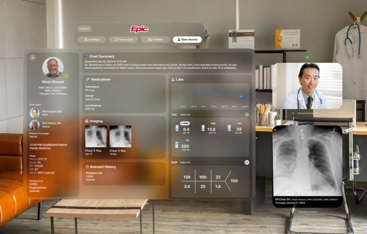السجلات الطبية جزء أساسي من عمل أي طبيب، ولتسهيل كيفية التعامل معها، طوّرت Epic Systems وهي شركة متخصصة في تصميم السجلات الصحية الإلكترونية، تطبيق Epic Spatial Computing Concept خصوصًا لنظارة Apple Vision Pro للسماح للأطباء بإنشاء السجلات الطبية الخاصة بمرضاهم بسهولة، ومراجعة نتائج التحاليل في المختبرات، والتواصل مع المرضى باستخدام نظام دردشة آمن من خلال إيماءات بديهية.