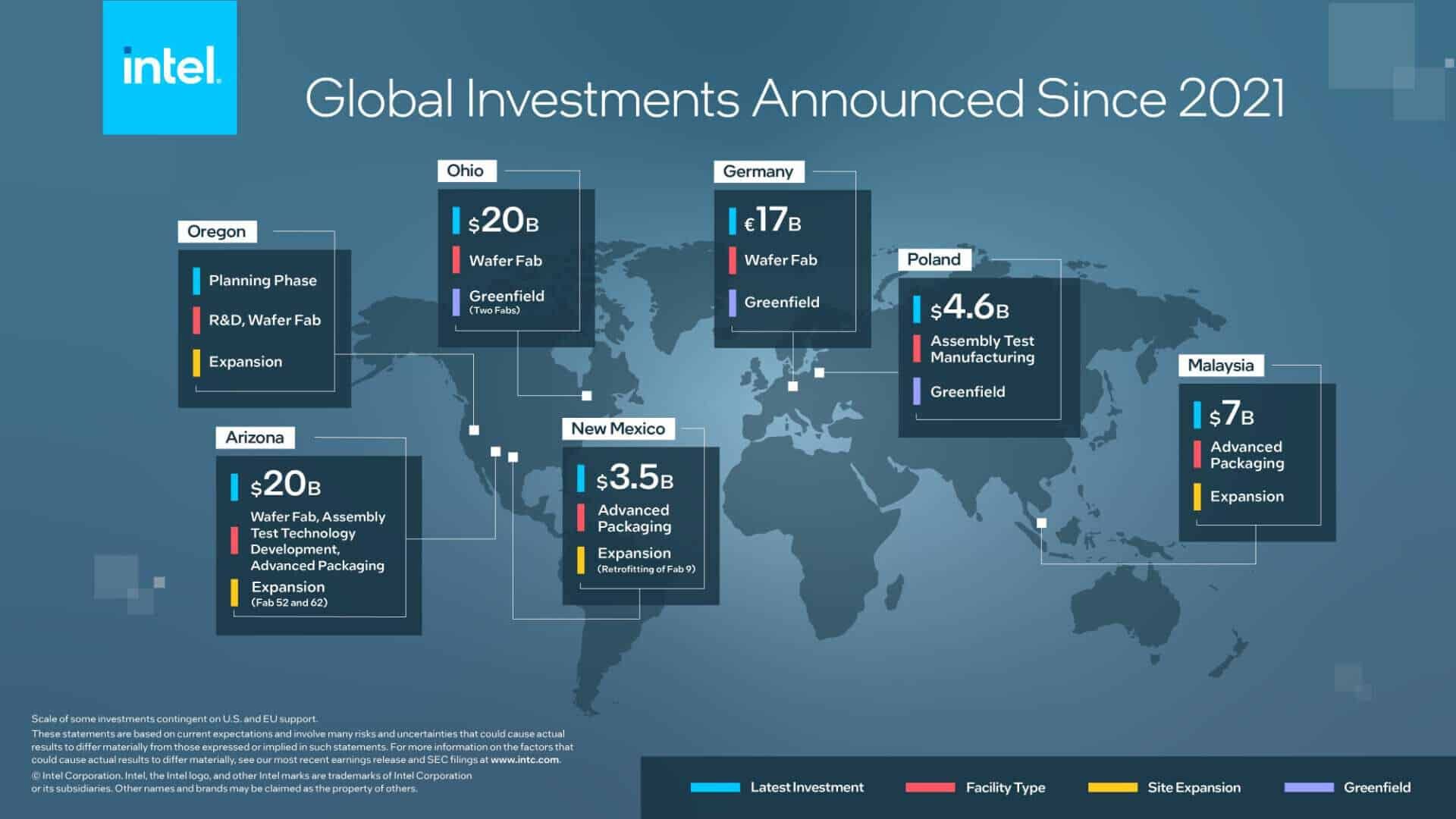 وقد أنفقت إنتل حتى الآن قرابة 4.5 مليارات دولارٍ، وهو مبلغ أدنى من ربع المبلغ الذي وعدت بإنفاقه على هذا المشروع. وكان من المفترض أن يعمل مصنعا الشركة، في ولاية أوهايو، بحلول العام المقبل؛ مع الإشارة إلى أن الحكومة الأمريكية منحت إنتل حوافز مالية بقيمة تبلغ ملياري دولارٍ لهذا المشروع.