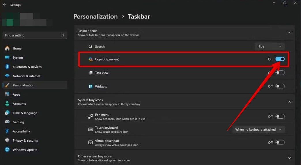 - اضغط على زر التبديل الموجود بجوار خيار (Copilot) لإخفائه من شريط المهام.
