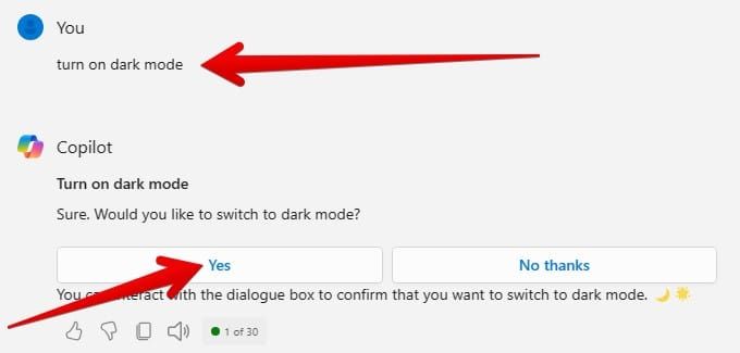 إذا كنت لا ترغب في البحث في قائمة الإعدادات داخل نظام ويندوز 11 لتغيير شيء بسيط، فيمكنك فقط كتابة مطالبة في (Copilot) ليقوم بذلك من أجلك. على سبيل المثال: إذا كنت تريد تشغيل الوضع الداكن، فاكتب (فعّل الوضع الداكن) Enable dark mode في حقل الدردشة، ثم اضغط على إرسال. سيُطلب منك تأكيد الأمر، لذلك اضغط على خيار (نعم) Yes، لإجراء التغيير.