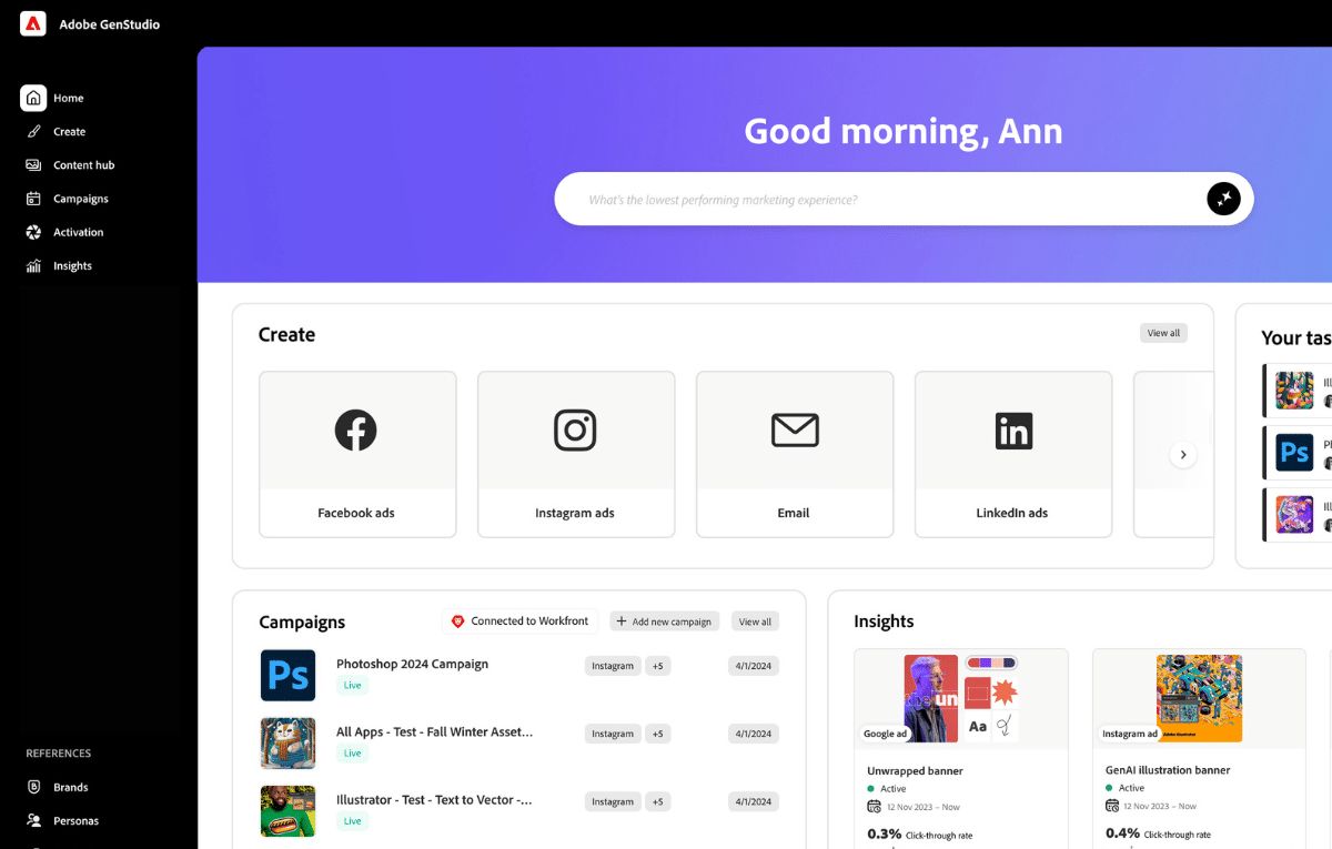 وتظهر GenStudio للمستخدمين السمات والأصول المولدة والحملات التي تحقق أفضل أداء، التي تقترح أدوبي أنه يمكن استخدامها بعد ذلك لتوجيه مطالبات الذكاء الاصطناعي للحملات الأخرى.