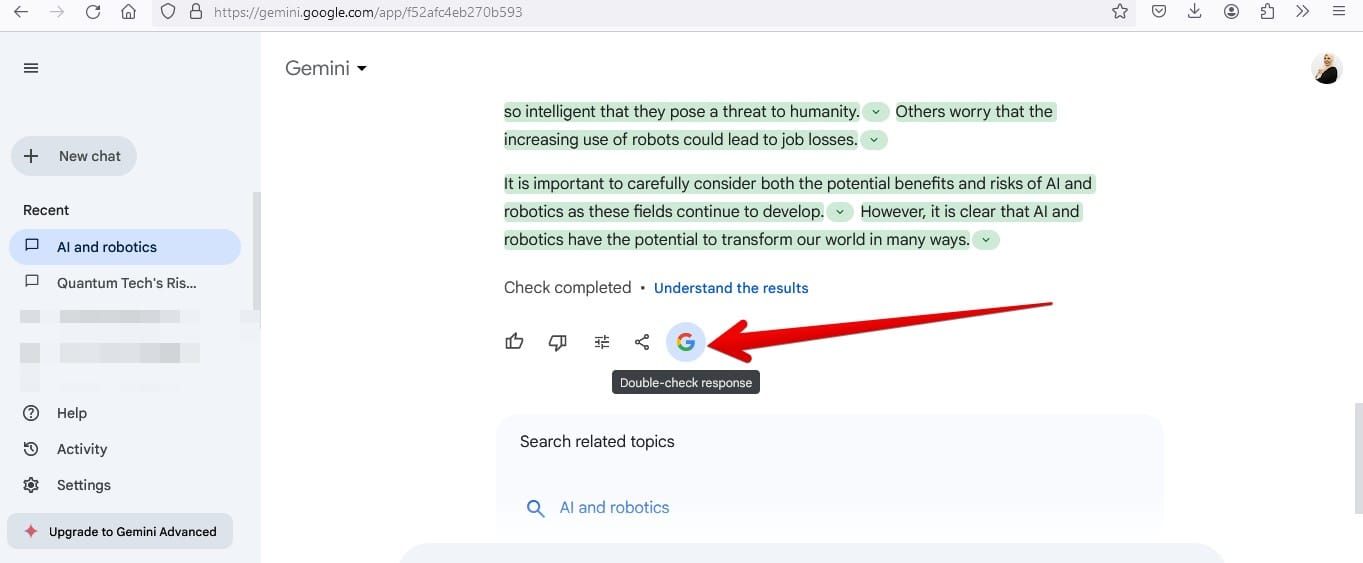 استنادًا إلى استجابة روبوت Gemini لسؤالك أو طلبك، يمكنك طرح أسئلة متابعة حول الموضوع نفسه للحصول على المزيد من المعلومات، ولكن بدلًا من ذلك؛ يمكنك الضغط على زر (Google it) الموجود أسفل الإجابة للتحقق من الإجابة بسرعة عن طريق البحث عنها في محرك بحث جوجل.