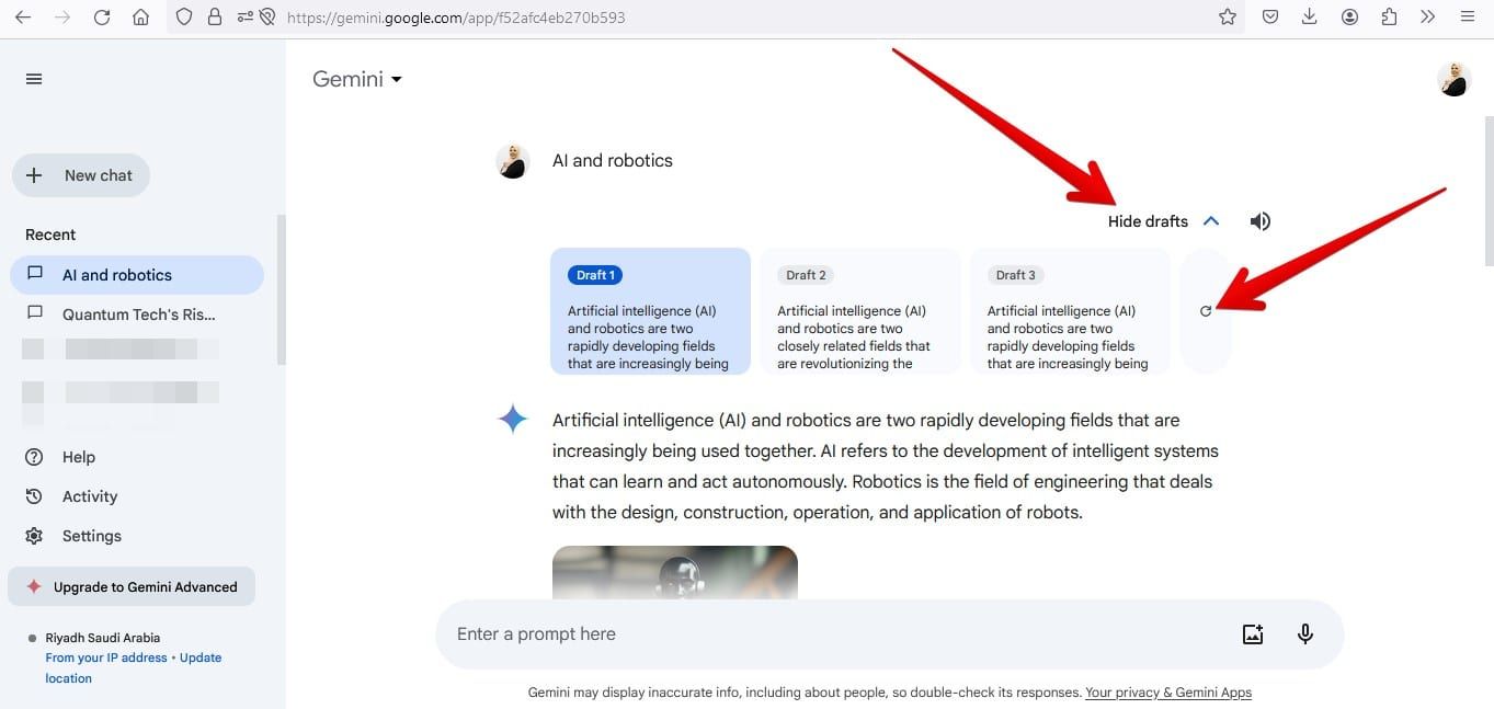 - اكتب مطالبتك لروبوت Gemini؛ ثم اضغط على زر الإدخال، ستظهر لك الإجابة عن سؤالك أو استفسارك، في ثلاث مسودات مختلفة يمكنك الاطلاع عليها بالضغط على خيار (اعرض المسودات الأخرى) View other drafts الظاهر في الزاوية العلوية اليمنى أسفل السؤال.