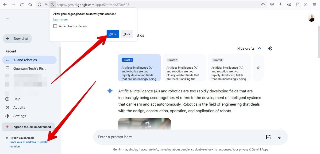 - ستظهر لك نافذة منثقة في أعلى الشاشة تتضمن طلب السماح للوصول إلى موقعك، اضغط على خيار (السماح) Allow، لمنح Gemini إمكانية الوصول إلى موقعك، ثم في نافذة حول هذا الموقع، اضغط على خيار (استخدام الموقع الدقيق) Use precise location.