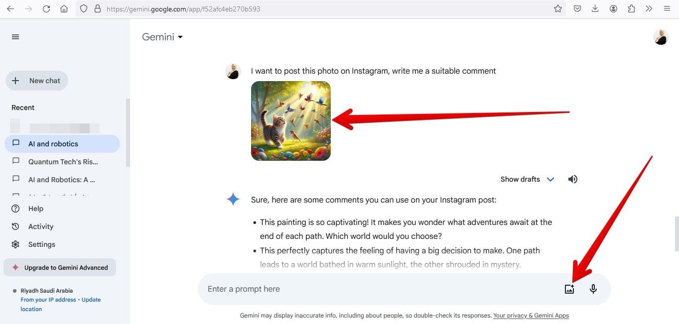لذلك يمتاز روبوت (Gemini) بقدرته العالية على معالجات الصور، إذ يمكنك تضمين أي صورة في المطالبات للاستفسار عنها أو كتابة تعليقات نصية عما تحتويه، ولاستخدام هذه المزية، يمكنك اتباع الخطوات التالية: