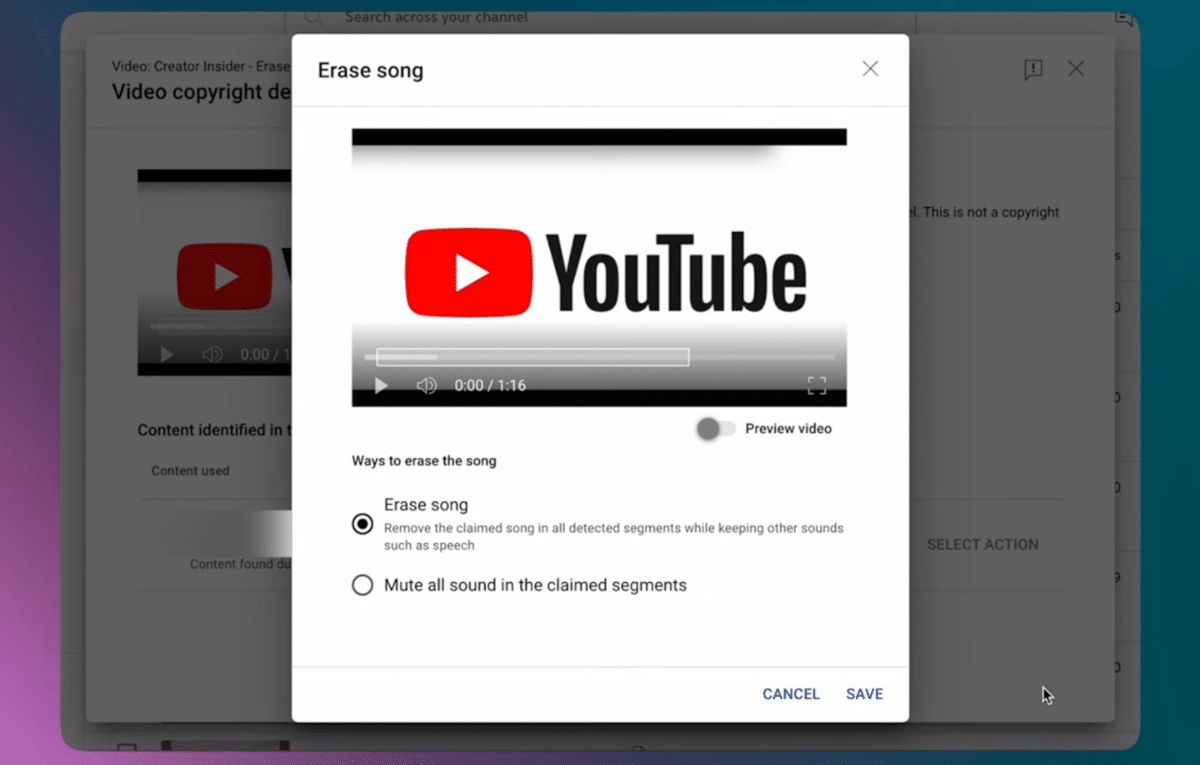أصدرت يوتيوب أداة ممحاة محدثة لمنشئي المحتوى حتى يتمكنوا بسهولة من إزالة أي موسيقى محمية بحقوق التأليف من مقاطع الفيديو دون التأثير في أي صوت آخر، مثل الحوارات أو المؤثرات الصوتية.