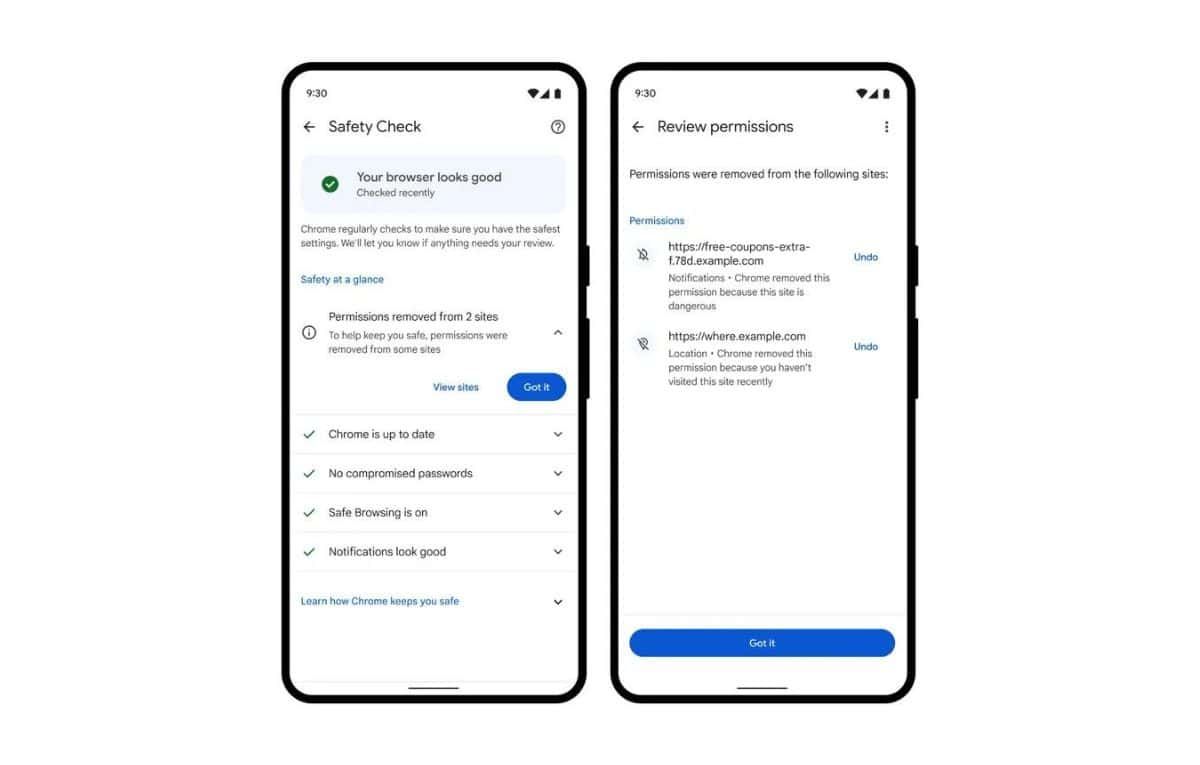 وستعمل أداة فحص الأمان Safety Check المدمجة في متصفح كروم الآن بنحو مستمر في الخلفية لاتخاذ خطوات حماية سريعة، وستُبلغ الأداة المستخدمين بالإجراءات التي تتخذها، والتي قد تشمل إزالة الأذونات من المواقع التي لم يعد المستخدمون يزورونها، وتلك التي يعتقد تصفح جوجل الآمن أنها تحاول خداع المستخدمين لمنحها أذونات إضافية.