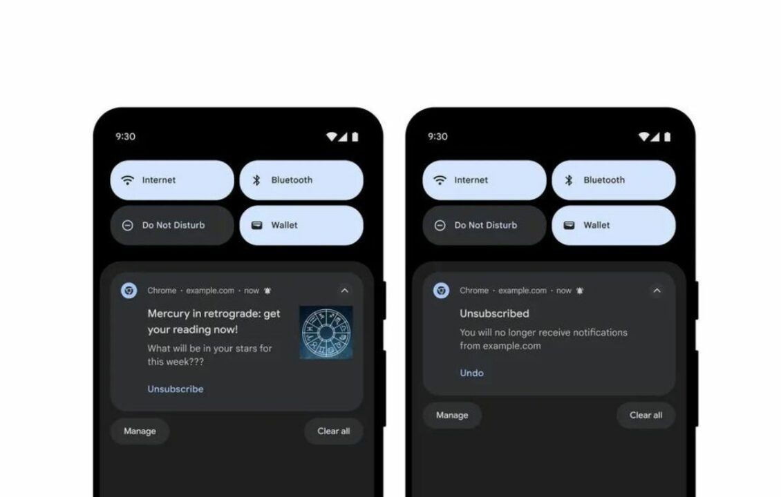 وبالإضافة إلى ذلك، ستوّسع جوجل القدرة على إلغاء الاشتراك من المواقع عبر زر واحد يجده المستخدمون مرفقًا بالإشعارات الواردة منها، وسوف يساعد ذلك على إلغاء الاشتراك من المواقع المزعجة بطريقة أسهل.