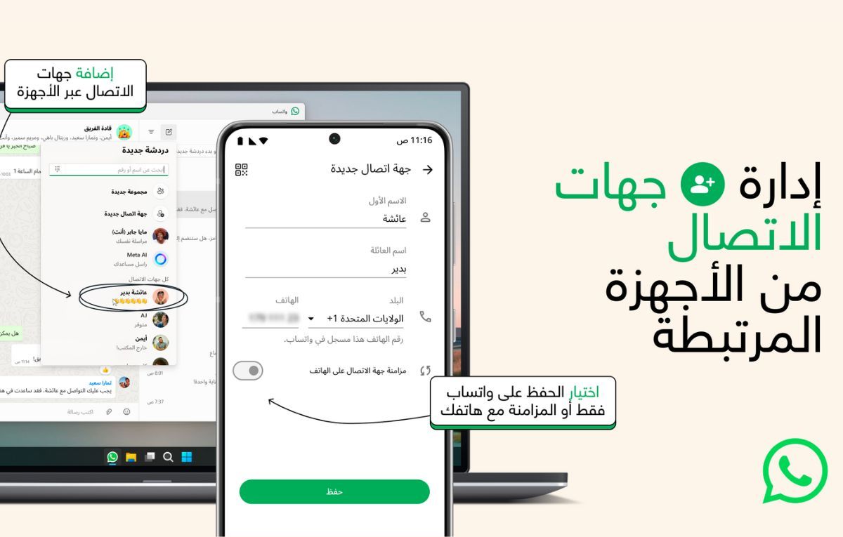 وتسمح الميزة الجديدة للمستخدمين بحفظ جهات الاتصال في التطبيق، ومزامنتها عبر كافة الأجهزة، ومنها نسخة الويب من واتساب وتطبيق ويندوز وماك. ويمكن للمستخدمين اختيار مزامنة جهات الاتصال المحفوظة داخل التطبيق مع الهاتف أيضًا.