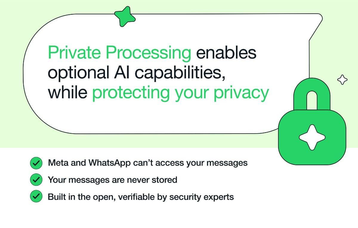 أعلنت شركة ميتا ميزة جديدة في تطبيق واتساب تحمل اسم “المعالجة الخاصة Private Processing“، وهي تُوفّر طريقة آمنة وخاصة للتفاعل مع مساعد الذكاء الاصطناعي الخاص بها Meta AI.