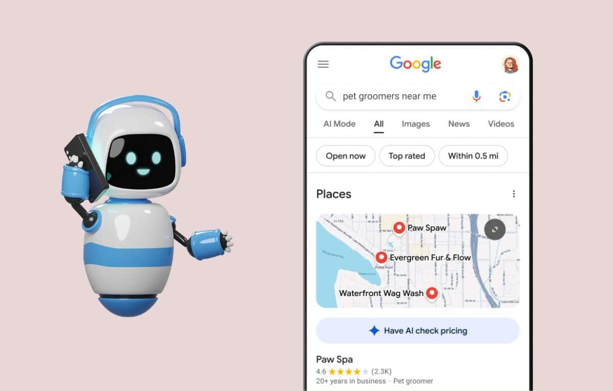 وتتوفر الميزة حاليًا من خلال خدمة “بحث جوجل”، إذ يمكن للذكاء الاصطناعي التحقق من الأسعار ومدى توفر الخدمات في متاجر تنظيف الملابس، ومحال العناية بالحيوانات، وورش إصلاح السيارات ومحال البقالة، وغيرها.
