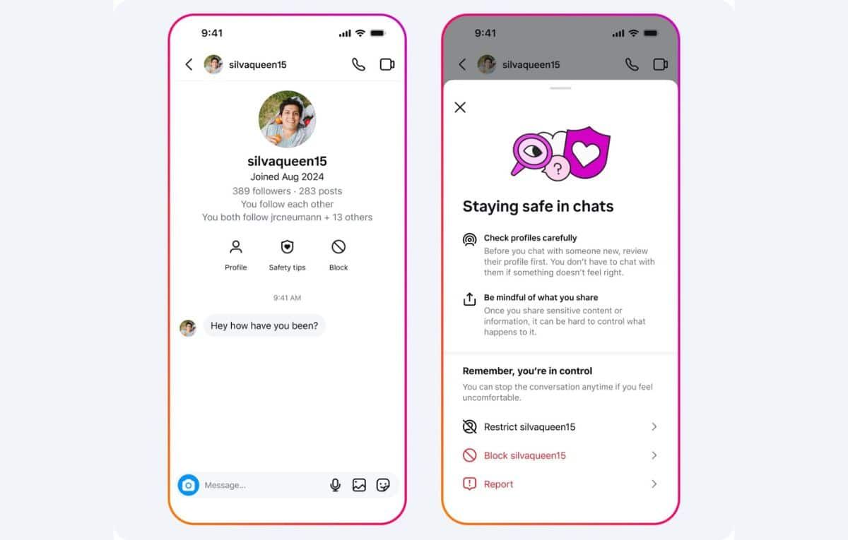 وفي سياقٍ متصل، أضافت الشركة مزايا جديدة لحماية المراهقين، منها إظهار تاريخ انضمام الحساب إلى إنستاجرام في أعلى المحادثات الجديدة، مع إتاحة خياراتٍ سريعة لعرض نصائح الأمان أو حظر الحساب. كما أصبح بإمكان المراهقين حظر الحساب والإبلاغ عنه بضغطة واحدة، مما يسهّل وصول فرق ميتا المختصة إلى الحسابات المخالفة واتخاذ الإجراء المناسب.
