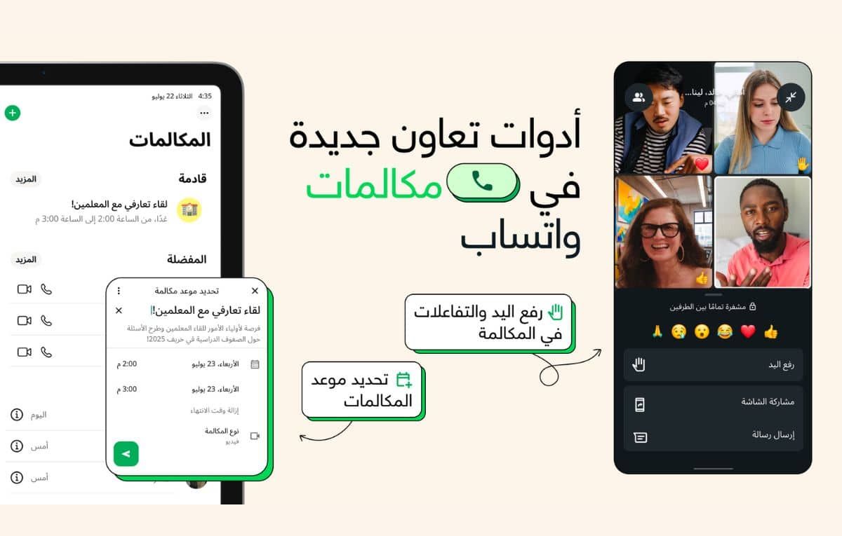 وإلى جانب ذلك، أضاف واتساب مزايا تفاعلية جديدة أقرب إلى ما تقدمه منصات الاجتماعات الاحترافية مثل Zoom و Google Meet، منها ميزة “رفع اليد” لإبداء الرغبة في التحدث، وخيار إرسال تفاعلات بالوجوه التعبيرية “الإيموجي” في أثناء المكالمات، وهي خيارات شائعة في تطبيقات الاجتماعات لكنها جديدة لمستخدمي واتساب.