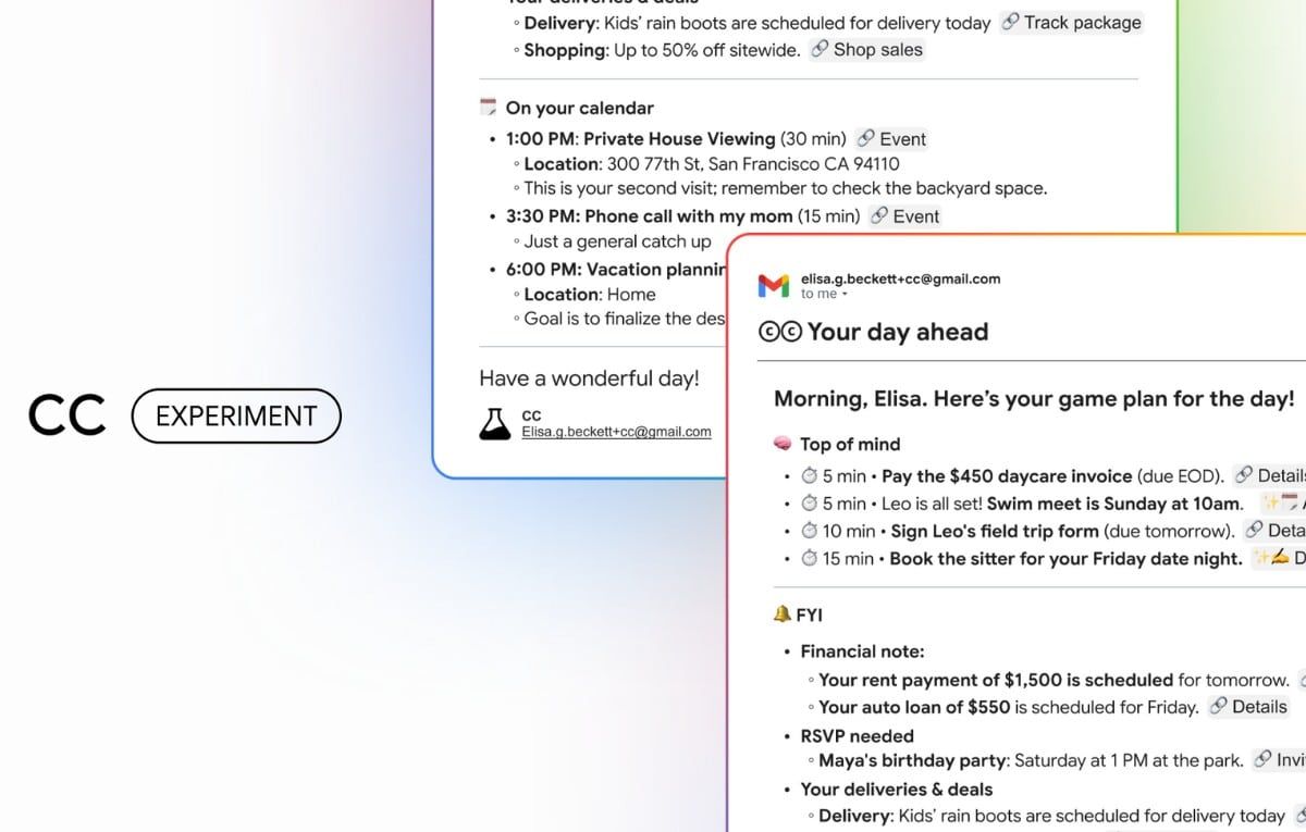 وبحسب جوجل، فإن “CC” يعمل بالتكامل مع نموذج Gemini، وهو يجمّع جدول اليوم والمهام الأساسية والتحديثات المهمة في ملخص واحد واضح يساعد المستخدم في معرفة ما ينبغي إنجازه لاحقا. ويُرسل هذا الملخص، الذي يحمل عنوان “ما ينتظرك اليوم Your Day Ahead”، مباشرةً إلى بريد Gmail كل صباح.