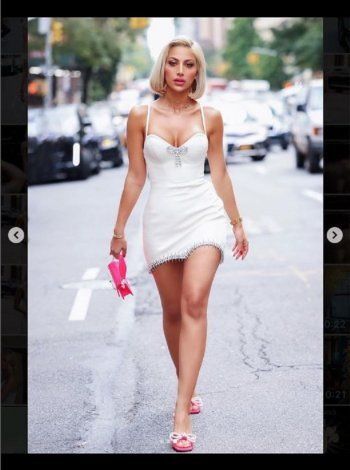 وظهرت مودل روز من أحد الشوارع، وهي ترتدي فستاناً باللون الأبيض ضيق وقصير وبقصة مميزة على أحد الساقين، ونسقت معه حذاء صيفي باللون الزهري وحقيبة يد صغيرة باللون نفسه.