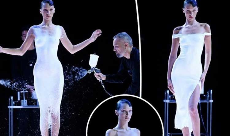 وخرجت بيلا أمام الحضور مرتديةً ملابس داخلية فقط ووقفت على منصة العرض بينما قام ثلاث رجال برشّ مادة بيضاء على جسدها تحولت إلى قماش ثم الى فستان نحت على جسمها مما أثار إعجاب الحاضرين لأنها المرة الاولى التي يقام عرض كهذا.