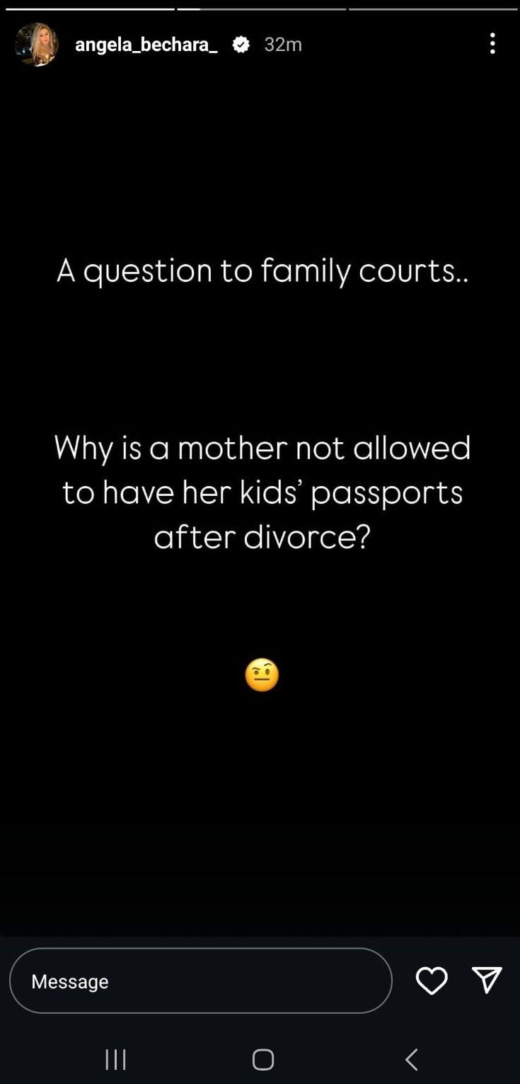 وجّهت أنجيلا بشارة طليقة الفنان وائل كفوري سؤالاً، وكتبت عبر خاصية "ستوري" عبر حسابها على "انستغرام": "لماذا الأمّ غير مسموح لها بالحصول على جوازات سفر أولادها بعد الإنفصال؟"