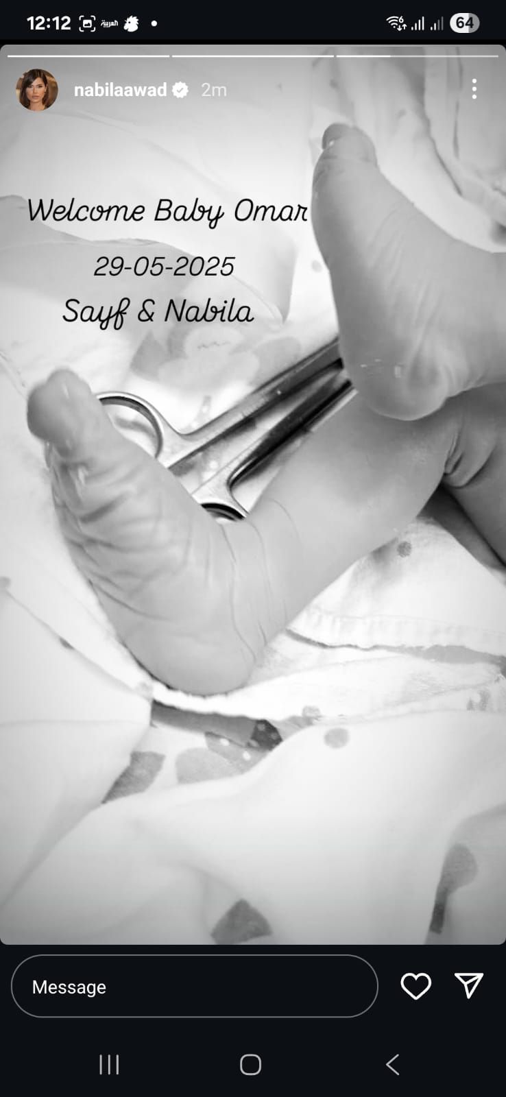 ونشرت نبيلة صورة من داخل غرفة العمليات لقدم ابنها الصغير للإعلان عن ولادته.