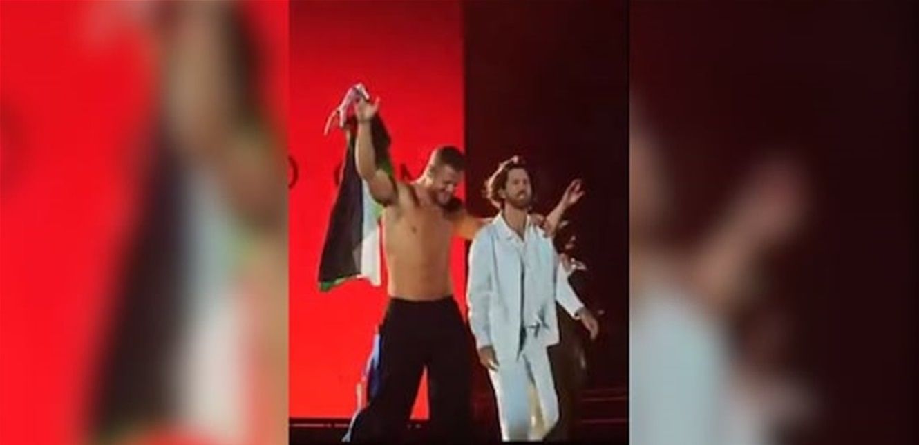 رفع المغني الرئيسي لفرقة "Imagine Dragons" الأميركية الشهيرة دان رينولدز العلم الفلسطيني خلال حفل أحياه في مدينة ميلانو الإيطالية.
