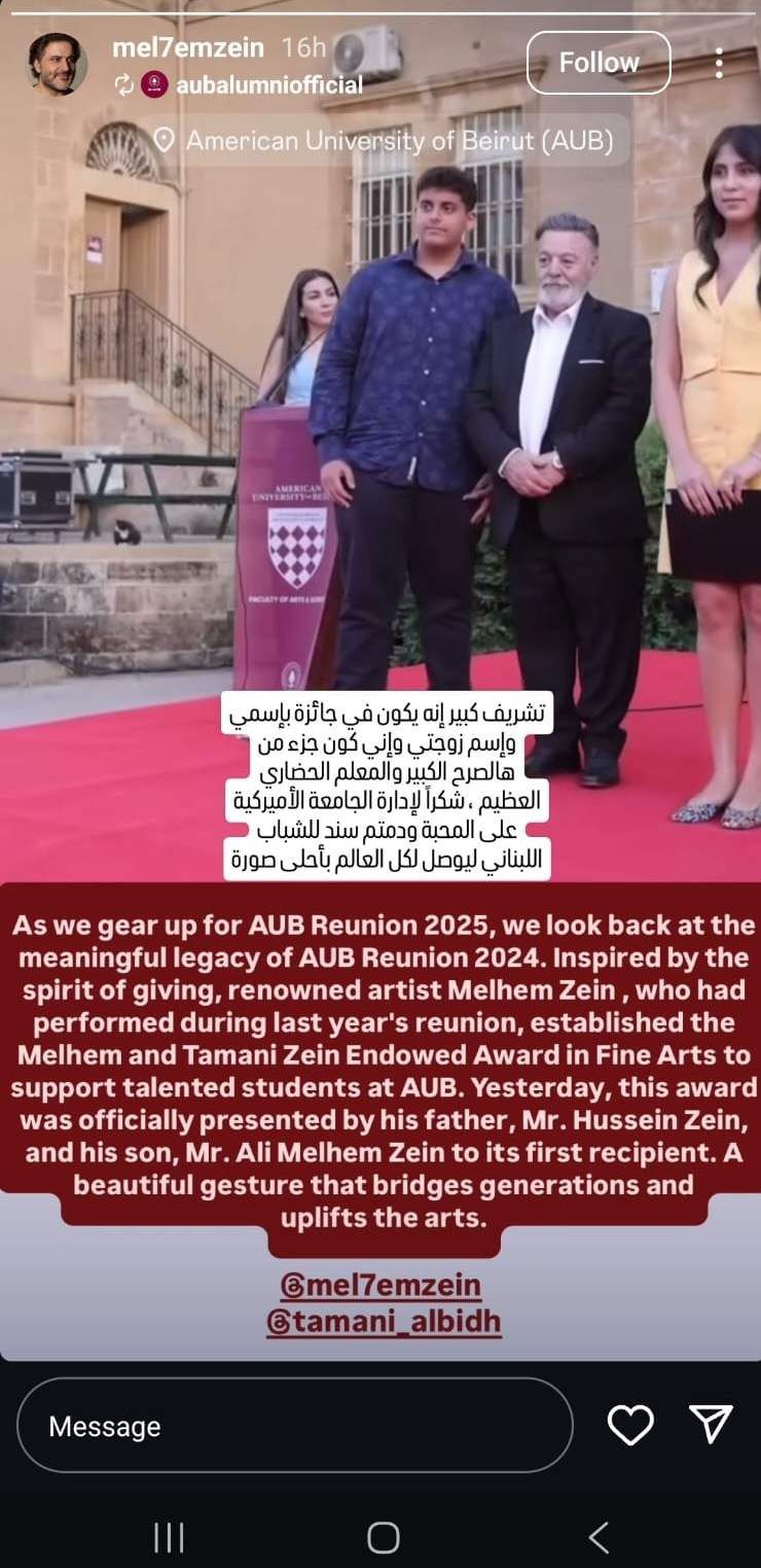 نشر الفنان ملحم زين عبر خاصية "ستوري" عبر حسابه على "انستغرام"، فيديو للحظة تسليم والده حسين وإبنه علي، لجائزة تحمل إسمه إلى إحدى الشابات، في الجامعة الأميركيّة لبيروت.