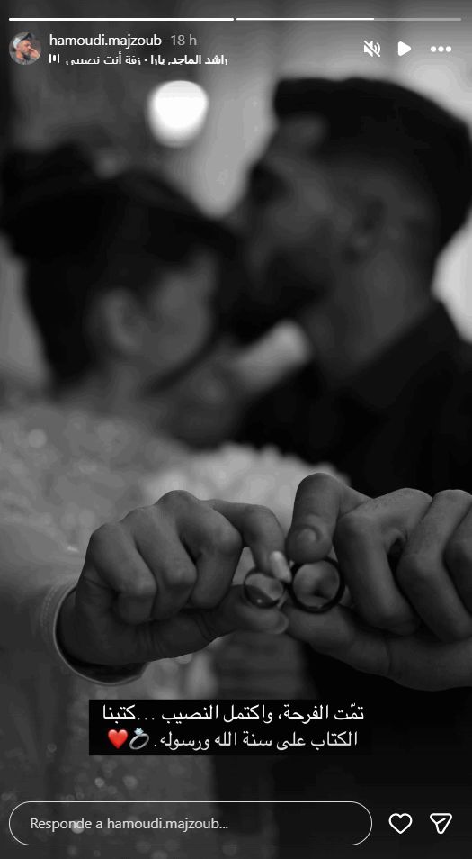 بالتوازي، نشر مجذوب صورة عبر خاصية الستوري على انستغرام، كاتبا:" تمت الفرحة واكتمل النصيب. كتبنا الكتاب على سنة الله ورسوله".