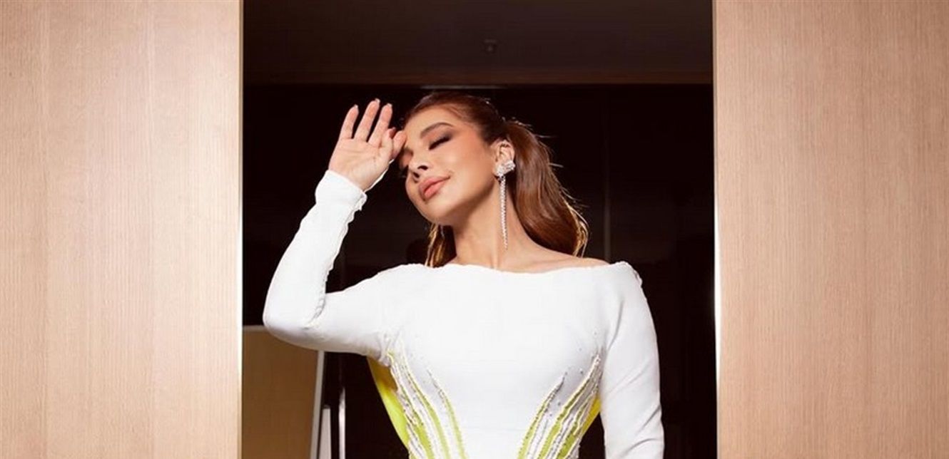 وأطلت أصالة بفستان أنيق باللون الأبيض من توقيع المصمم اللبناني نيكولا جبران.