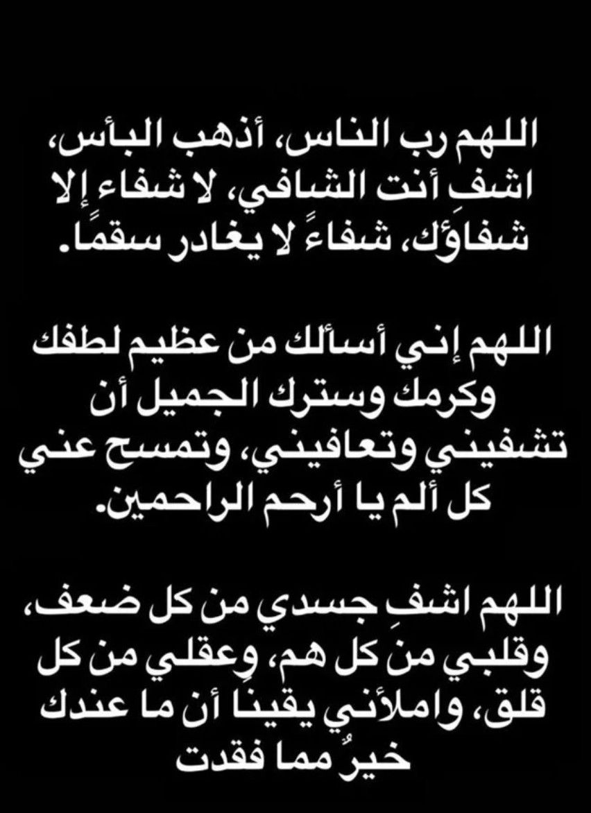 وكتبت ملك، عبر خاصية القصص المصوّرة المُلحقة بحسابها الشخصي في "إنستغرام" منشوراً قالت فيه: "اللّهم ربّ الناس، أذهب البأس، اشفِ أنت الشافي، لا شفاء إلا شفاؤك، شفاءً لا يغادر سقماً. اللّهم إني أسألك من عظيم لطفك وكرمك وسترك الجميل أن تشفيني وتعافيني وتمسح عني كل ألم يا أرحم الراحمين. اللّهم اشفِ جسدي من كل ضعف، وقلبي من كل همّ، وعقلي من كل قلق، واملأني يقيناً أن ما عندك خير مما فقدت".