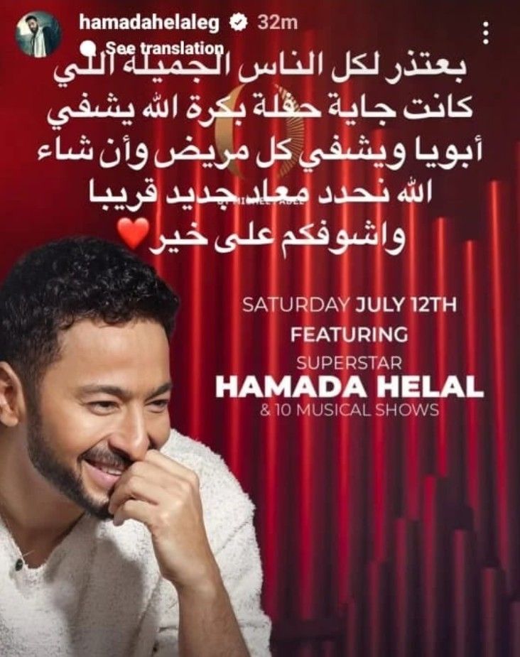 اعتذر الفنان المصري حمادة هلال عبر منشور على خاصية الستوري على حسابه الخاص بـ"إنستغرام" بشكل مُفاجئ عن حفله الغنائي، الذي كان من المقرر أن يحييه مساء اليوم السبت 12 تموز في مهرجان مراسي بالساحل الشمالي.