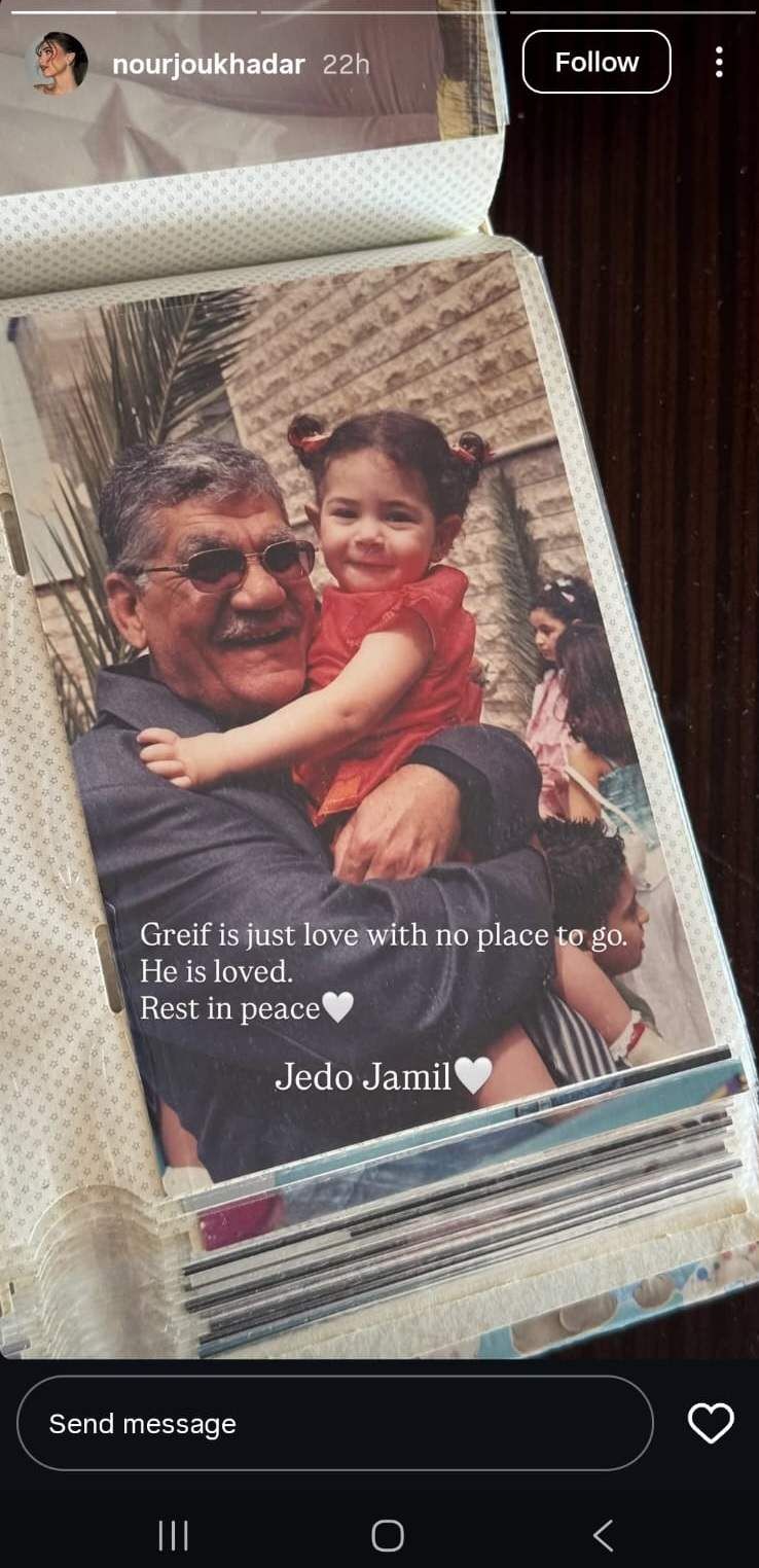 أعلنت الممثلة نور جوخدار عن وفاة جدّها جميل. وقالت نور عن جدّها: "انه الحب، فلترقد روحك بسلام جدو جميل". Advertisement