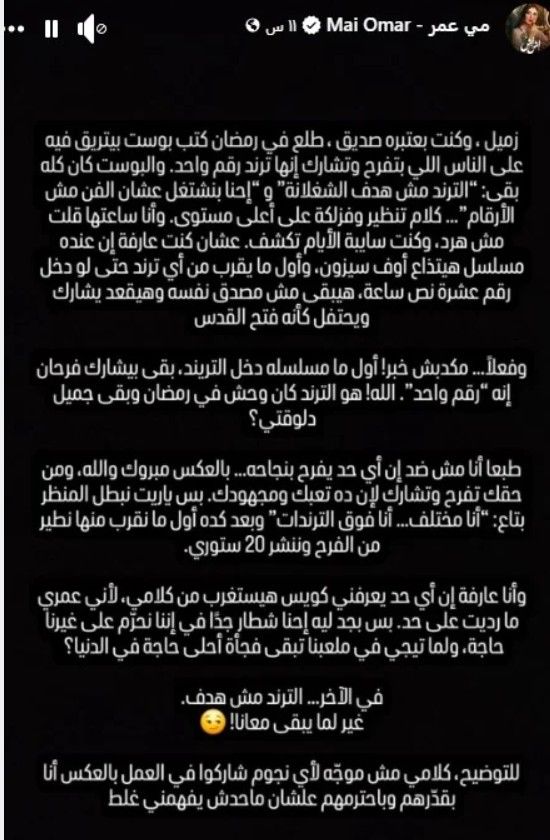 ونشرت مي منشورا عبر حسابها على "فيسبوك"، أشارت فيه إلى ان هذا الزميل الذي كانت تعتبره صديقاً، كان قد نشر خلال شهر رمضان الماضي تدوينة ساخرة من الفنانين الذين يحتفلون بتصدّر أعمالهم "التريند"، معتبراً أن النجاح لا يُقاس بالأرقام، وأن الفن أسمى من مطاردة مؤشرات الشهرة الرقمية.