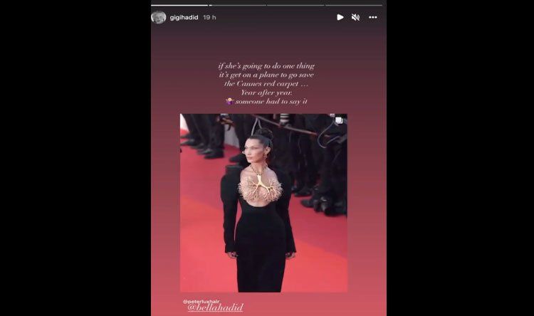 ونشرت جيجي حديد عدة صور وثقت من خلالها إطلالات بيلا خلال مهرجان “كان” السينمائية، وظهورها على السجادة الحمراء، وقالت إن “إذا كان لديها واجب واحد لإتمامه، فهو الذهاب إلى مهرجانات كان السينمائية والظهور على السجادة الحمراء وإنقاذ المشهد بإطلالاتها… عاماً بعد عام… كان على أحد أن يقول هذا”.